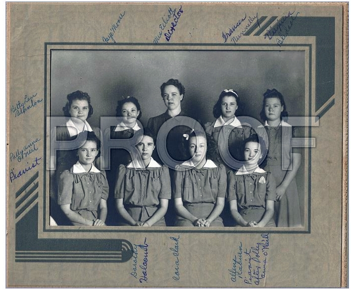 Front row:  Polly Anna O’Neil (pianist), Dorothy Holcomb, Cora Clark, Allene Rayburn (Pianist after Polly Anna O’Neil