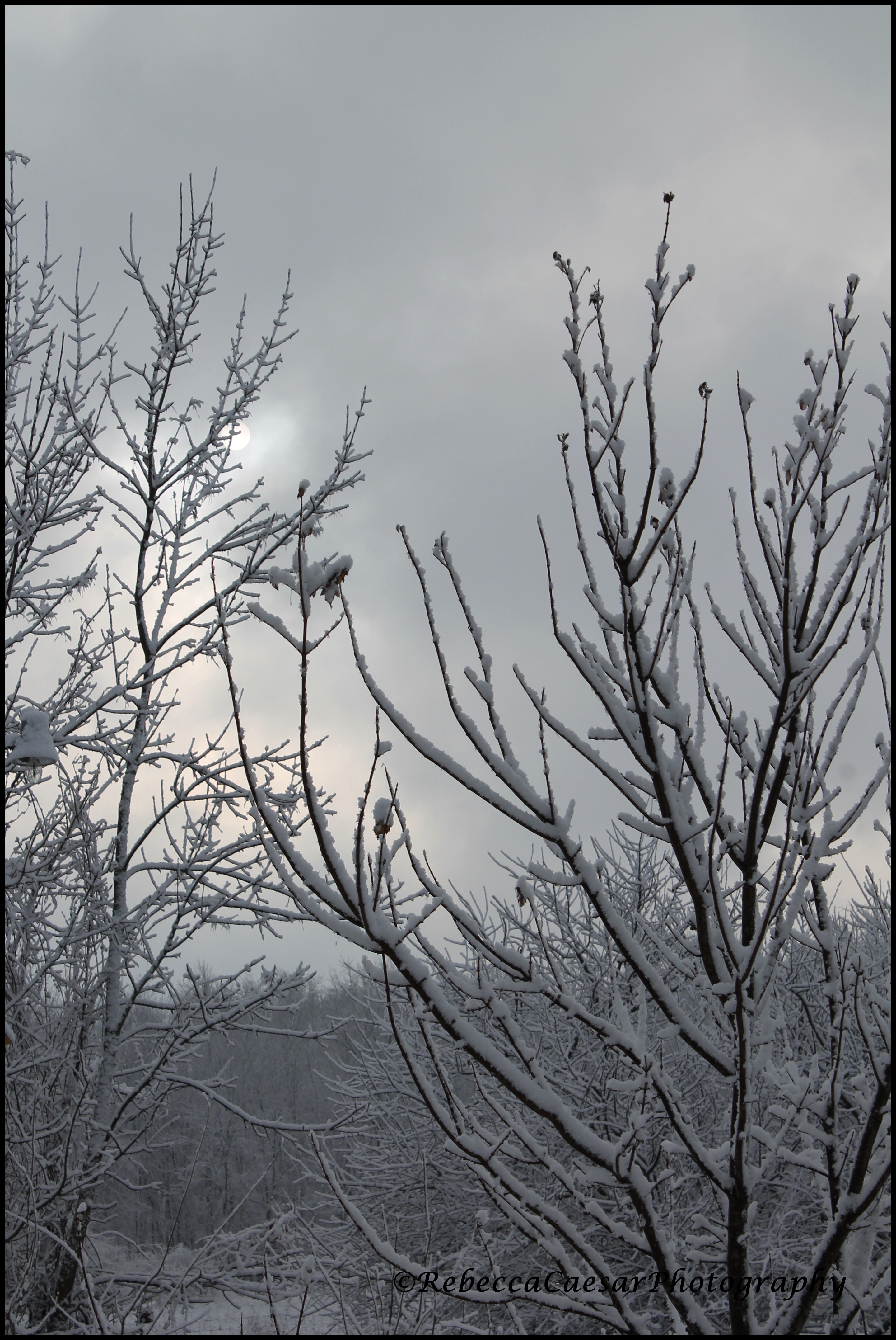The sun peaking through the clouds on the snowy day.