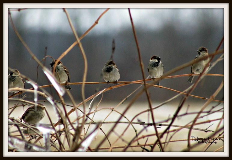 Right outside my porch, the tiny Sparrows are always visible. They spend most of the time at the feeder, especially in the winter. I have come to the conclusion they get their way by sitting on the nearby branch and staring at me. I know, they are probably not watching me. When the feeders are empty, I believe they sit there just to make me feel extremely guilty. Many people do not like the Sparrows, I enjoy watching them as they flutter around my feeders.