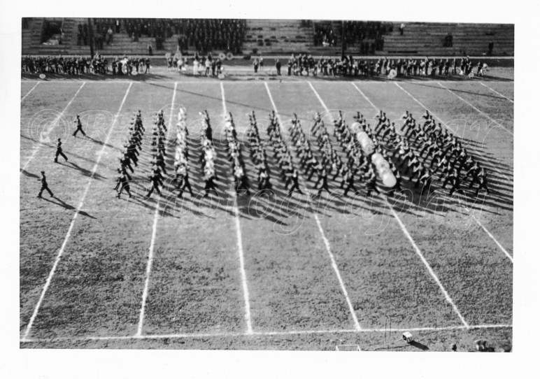 The back of this print reads, “This is our 38th Div. Band. 170 men and the drum major. The 37th Div. Band of 100 men is waiting on the sidelines. Picture taken before game, before much of a crowd had come.”