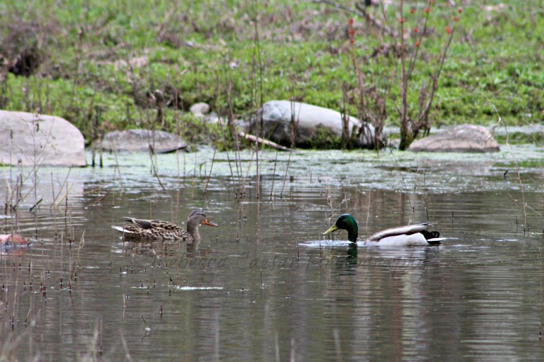 In my area of Michigan, the water is still high. The increased water levels have both negative and positive aspects. I love the fact that I get to view so many different forms of wildlife. Swimming in an over filled pond, this pair of Mallards were fun to watch. They would dive and skim insects off the top of the very murky water.