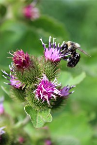 Off from my porch, I have a Burdock plant in bloom. I know most people wonder why I let the “weed” grows so close to my house. The answer is simple. Photographing bees.