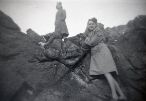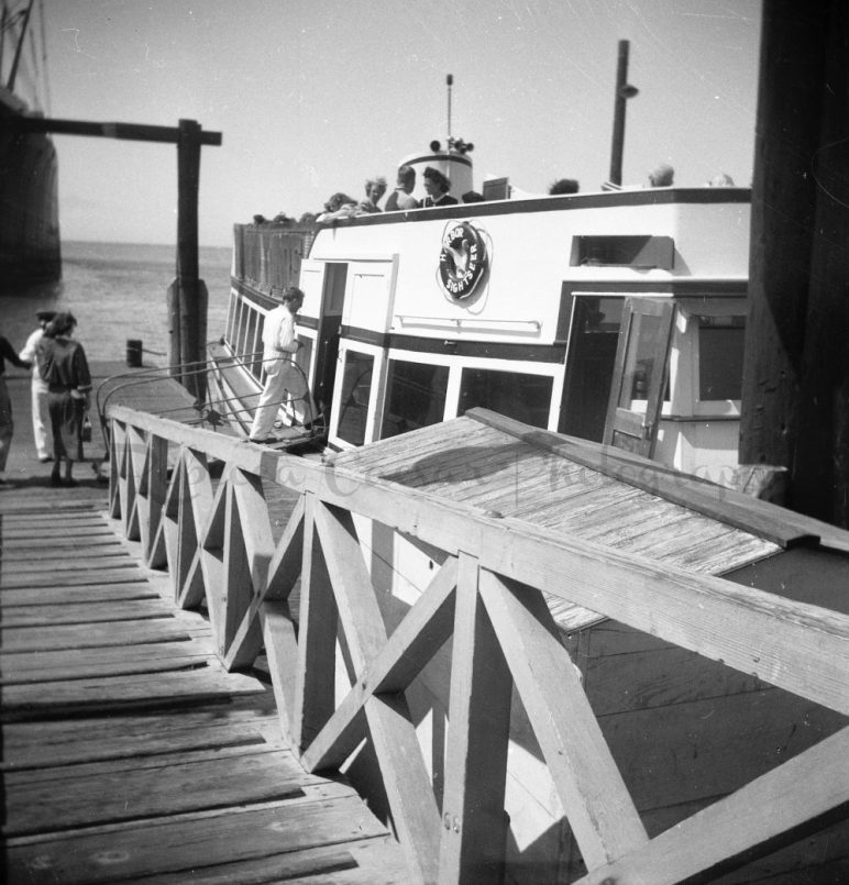 I believe this photo is from the early 1950s. My guess is based on the type of negative. The image shows a couple boarding a boat. In the background, I view a larger ship, which leads me to believe they are on a large body of water. Perhaps, one of the Great Lakes, a bay, or the ocean. Of course, I have no way to fact check this guess.