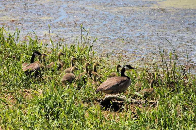 Today, I was able to spend time photographing baby geese. There’s just something fun and heartwarming watching the little goslings swim around the river. The mother kept gathering them together. She would nudge them to the safety of the lily pads if she thought they were in danger. There are a lot of vehicles that travel on the road; louder ones would cause her to scurry them to safety.